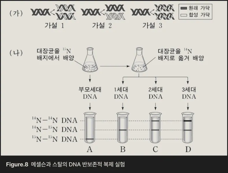 1958년 메셀슨Matthew Meselson 과 스탈Franklin Stahl 은 DNA가 복제되는 방식을 직접 증명했습니다. 그들은 질소 동위원소(¹⁵N, ¹⁴N)를 이용해 DNA가 세대를 거치며 어떻게 나뉘는지를 살펴보았습니다. 그 결과 DNA의 두 가닥이 갈라져서 각각 새로운 가닥의 설계도가 된다는 사실이 확인되었습니다. 이를 ‘반보존적 복제’라고 부릅니다.