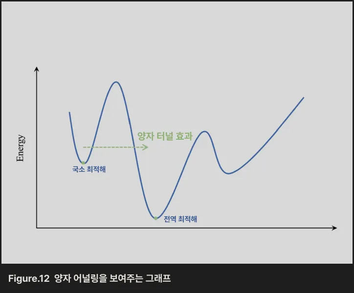 고전적인 어닐링에서는 입자가 높은 장벽에 막히면 그 너머의 더 낮은 에너지 상태로 이동하지 못합니다. 하지만 양자 어닐링에서는 입자가 마치 산을 통과하듯, 터널을 뚫고 더 낮은 에너지 상태로 이동할 수 있습니다. 이 덕분에 시스템은 훨씬 빠르게, 그리고 더 효율적으로 전역 최적해(global minimum)에 도달할 수 있습니다.