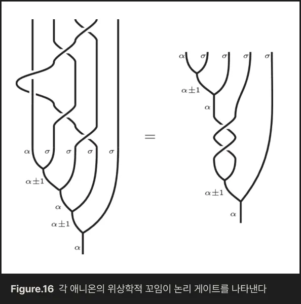 위상 양자컴퓨터는 완전히 다른 접근을 합니다. 이 방식은 정보를 입자 하나의 상태에 저장하지 않고, 여러 입자들의 상대적인 배치(꼬임) 에 저장합니다. 여기에는 ‘애니온Anyons’이라는 특수한 입자들이 등장하죠. 애니온들이 서로를 감싸며 움직인 궤적이 머리카락을 땋은 모양처럼 꼬이는데, 바로 이 꼬임의 형태가 정보가 됩니다.