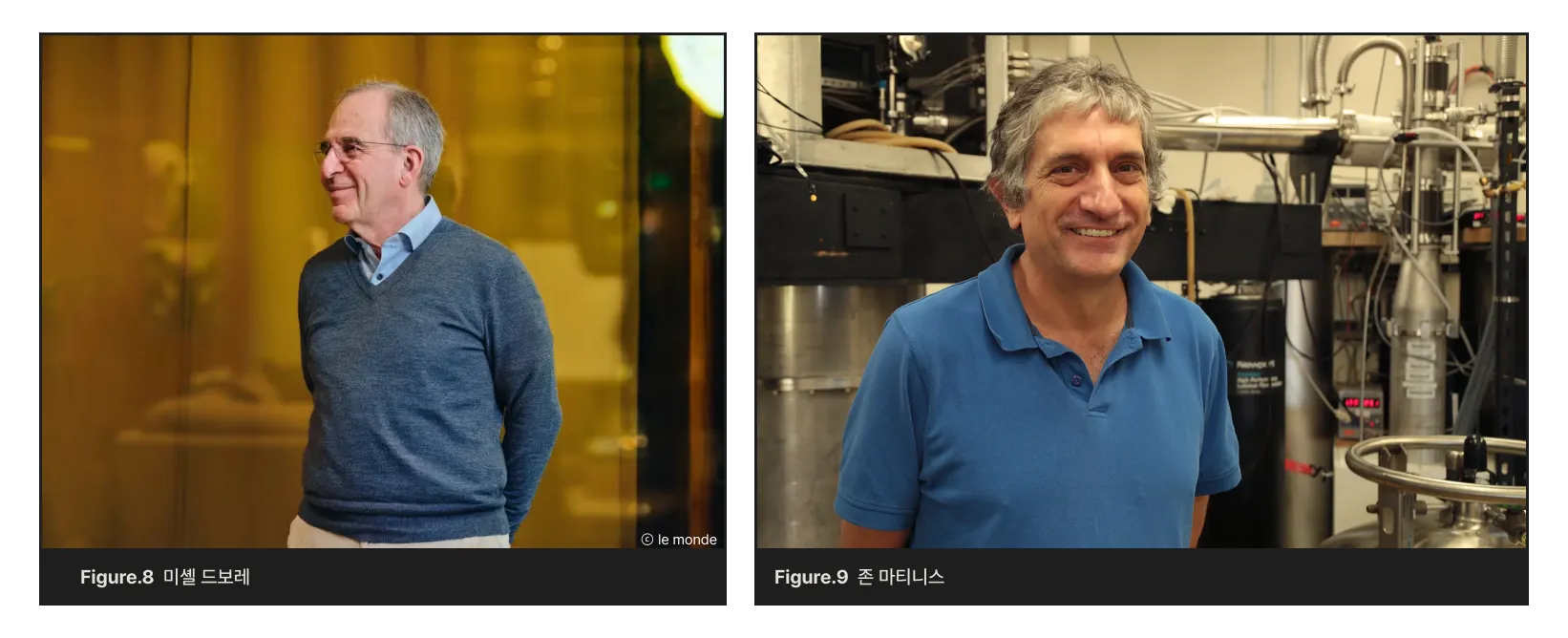 미셸 드보레Michel Devoret 와 존 마티니스John Martinis 는 클라크의 연구를 계승하여 초전도 회로 안에서 양자 상태를 더 안정적이고 정밀하게 다루는 기술을 개발했습니다. 드보레는 초전도 회로 내에서 양자 상태를 안정적으로 유지하고 측정하는 기술을 발전시켰고, 마티니스는 이를 기반으로 실제 초전도 큐비트를 집적·조작하는 시스템을 구축했습니다. 이들의 연구는 훗날 IBM, 구글, 인텔 등이 사용하는 초전도 양자컴퓨터 아키텍처의 직접적인 시초가 되었습니다.