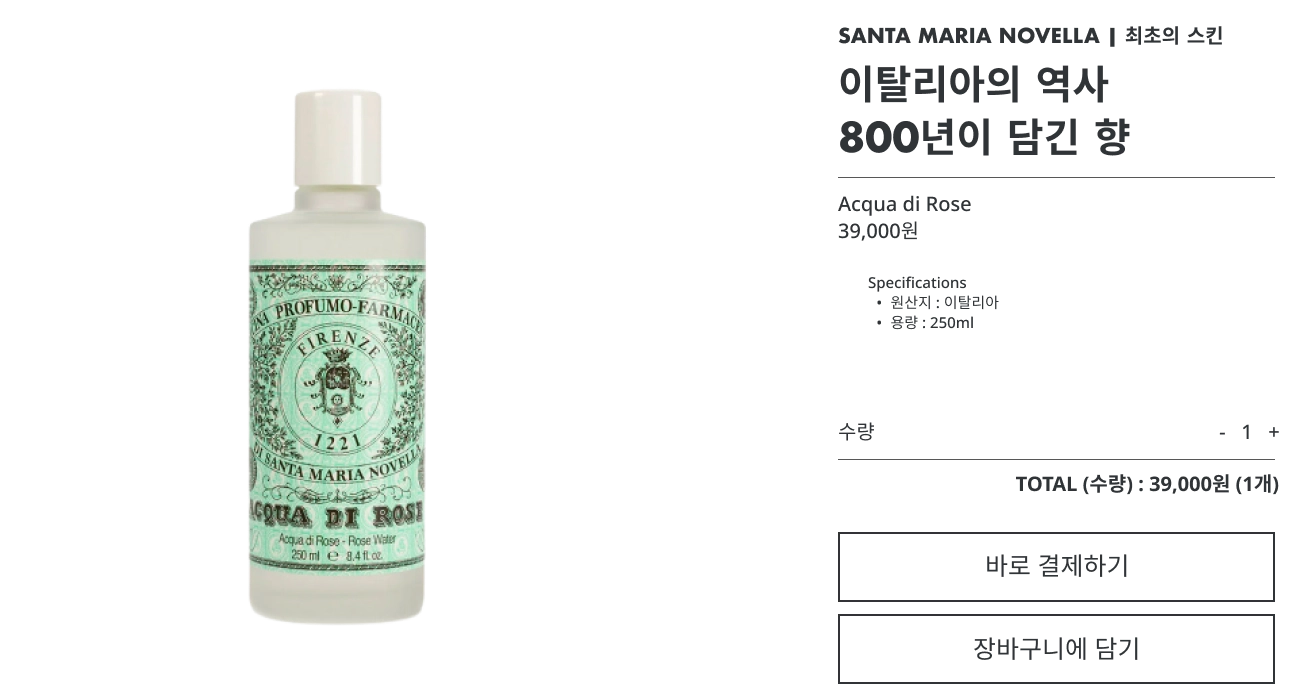 산타 마리아 노벨라는 오래된 역사만큼이나 흥미로운 이야기들이 많았습니다. 이번 기회에 1381년부터 제조되었다는 장미 스킨 토너를 구매해 보았는데요. 은은한 향이 매력적이더라고요. 중세 사람들의 기호도 우리와 크게 다르지 않았나 봅니다.