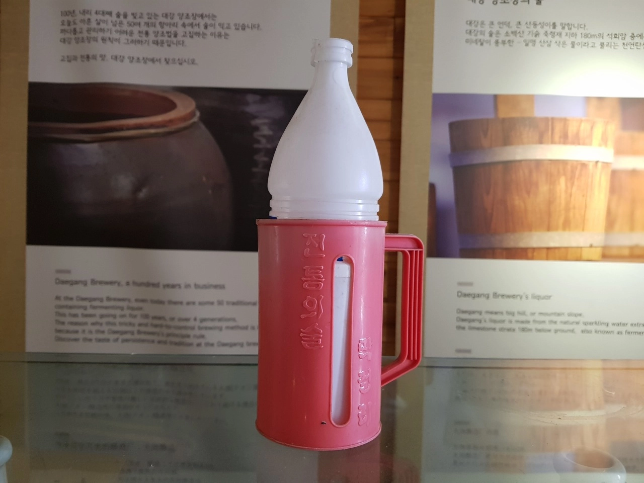 1978년이 되어서야 정부에서 막걸리 단위 포장을 의무화하고 PE 재질의 1리터 병을 보급합니다. 처음 도입된 용기는 병의 어깨 부위에 있는 돌기를 가위로 오려내서 따르는 형태였는데요. PE 재질이 워낙 얇다 보니 왈칵 쏟아지는 경우가 많았어요. 이를 해결하고자 용기 윗부분에 돌려 따는 뚜껑을 추가하고 막걸리 병을 장착할 수 있는 손잡이가 달린 케이스를 보급하죠.