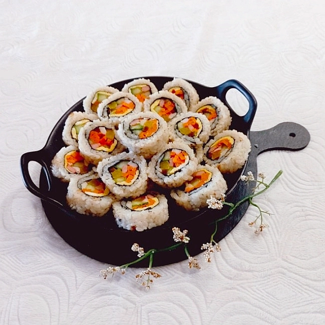 김 위에 밥을 펴 놓고 여러 가지 반찬으로 소를 박아 둘둘 말아 싸서 썰어 먹는 음식