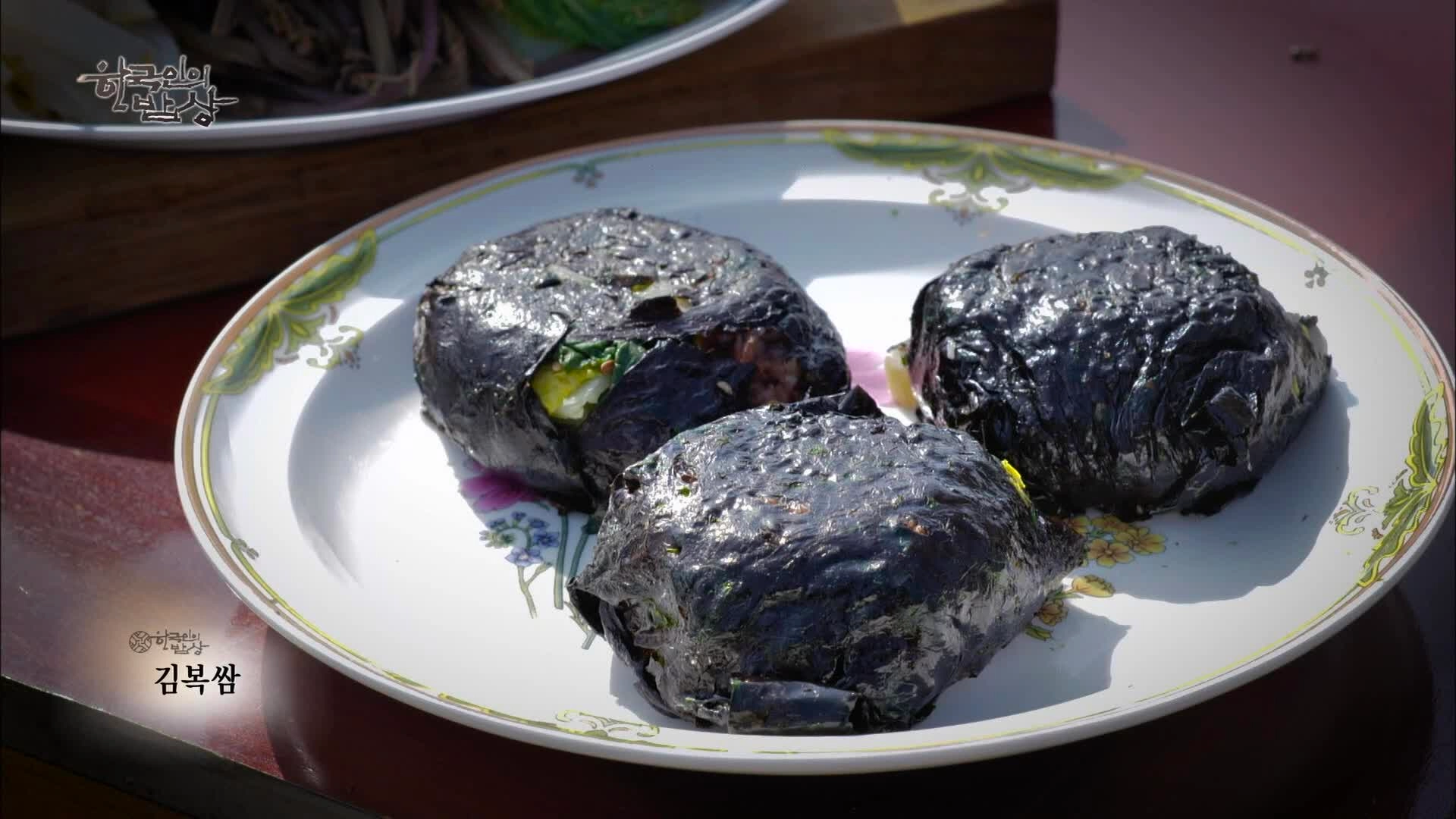 19세기 <동국세시기>에는 정월대보름에 김이나 배춧잎, 곰취잎 등에 밥을 싸 먹는 음식인 복과가 등장하는데요. 한자 표기를 위해 과로 적혀있지만, 원래 이름은 복쌈이라고 합니다. 여기에 김으로 싼 복쌈을 김쌈이라고 했죠. 비슷한 시기 쓰인 <시의전서>에는 김에 기름을 바른 뒤, 소금을 뿌려 재워두었다가 구워 네모반듯하게 잘라 밥에 싸 먹는 음식을 김쌈이라고 소개합니다.