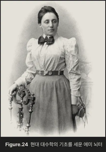한편 환론은 데데킨드의 아이디얼 덕분에 강력해졌지만, 여전히 복잡한 문제가 있었습니다. 어떤 환에서는 아이디얼이 끝없이 꼬리를 물고 생겨나서 연구 자체가 불가능해지는 경우가 있었던 겁니다. 여기서 에미 뇌터Amalie Emmy Noether 가 혁신적인 조건을 제시했습니다. 아이디얼이 무한히 늘어나지 않고, 항상 유한 개의 생성자로 표현될 수 있는 환을 따로 구분하자는 것이었습니다. 이렇게 정의된 환이 바로 노터 환입니다.