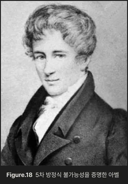 이후 1824년, 당시 22세였던 노르웨이 수학자 아벨Niels Henrik Abel 은 획기적인 증명을 제시했습니다. 그는 “차수가 5 이상인 방정식에 대해, 일반적인 근의 공식은 사칙연산과 거듭제곱근만으로는 표현할 수 없다”는 사실을 엄밀히 증명한 것이었죠. 이로써 5차 이상의 방정식은 일반적인 근의 공식으로는 절대 풀 수 없다는 것이 수학적으로 확정된 것입니다.