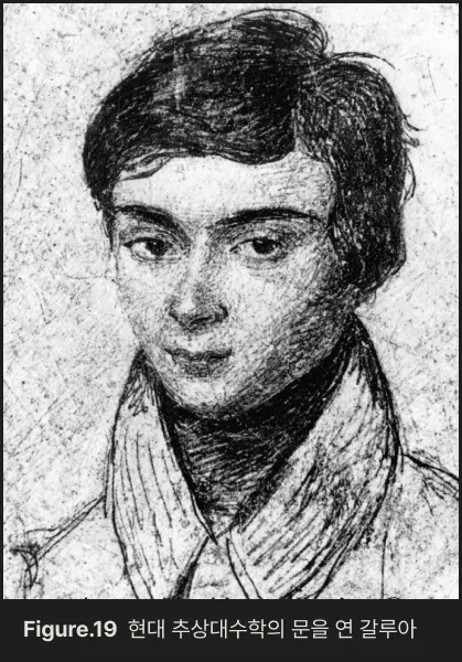 그러나 문제는 여기서 끝나지 않았습니다. 왜 어떤 방정식은 풀리고, 어떤 방정식은 풀리지 않는가를 설명할 새로운 이론이 필요했습니다. 이 답을 제시한 인물이 프랑스의 수학자 갈루아Évariste Galois 였습니다. 그는 방정식의 해들이 갖는 대칭적 성질에 주목했습니다. 해들을 서로 바꾸는 변환들의 집합을 체계적으로 분석했고, 이를 하나의 집합과 연산으로 표현했습니다. 이 구조가 바로 오늘날의 군(Group) 개념입니다. 갈루아는 5차 이상의 방정식이 일반적인 근의 공식으로 풀리지 않는 이유를, 해의 대칭성이 가진 군 구조를 통해 설명했죠. 이것이 갈루아 이론이며, 현대 추상대수학의 출발점이 되었습니다.
