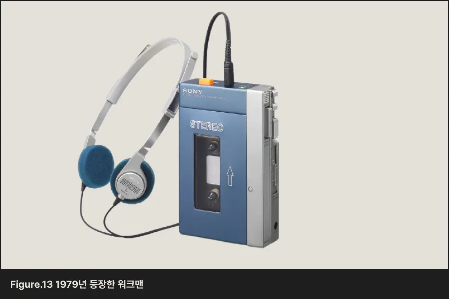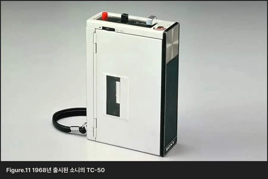 이처럼 카세트 테이프가 점차 대중화되고 있었지만, 주로 녹음 및 업무, 학습용으로 사용되었습니다. 음악 감상용으로는 LP가 더 대중적이었죠. 카세트 테이프가 LP의 자리를 넘보게 된 계기는 무엇보다 휴대용 카세트 테이프 플레어이어의 등장이었죠.