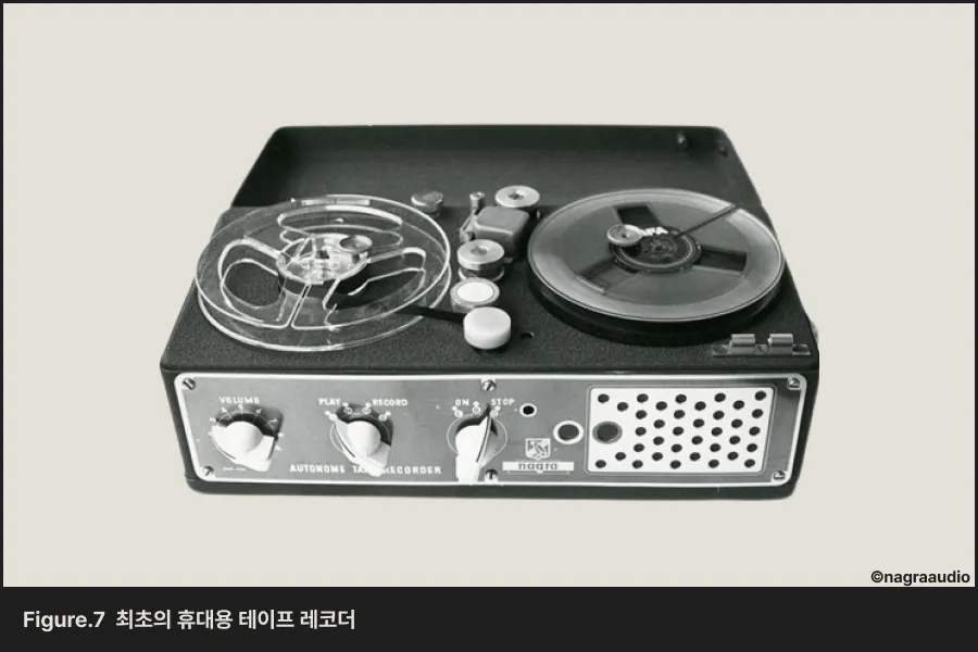 곧이어 휴대용 테이프 레코더도 등장합니다. 1951년 스테판 쿠델스키Stefan Kudelski 가 만든 나그라Nagra 가 그 주인공이죠. 나그라는 시네 카메라와 동기화할 수 있는 기능을 갖추고 있어, 영화 촬영 현장에서 주요 음향 녹음 장비로 사용되었습니다.