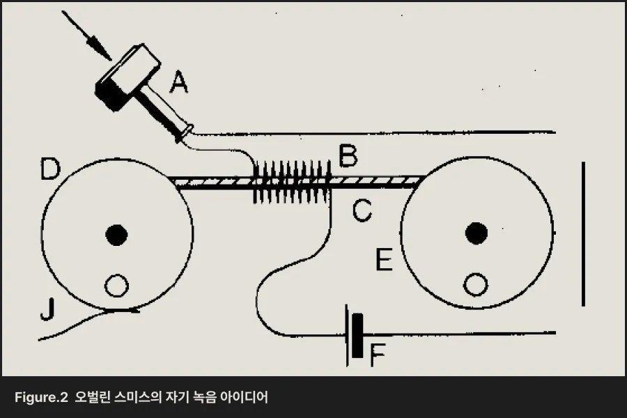 반면 1888년경, 미국의 오벌린 스미스Oberlin Smith 는 그래모폰과 달리 기계적 녹음 방법과는 완전히 다른 자기 녹음의 아이디어를 처음으로 생각해 냈습니다. 스미스는 이 아이디어를 특허로 등록하지 않고 공개하는데요. 이를 보고 영감을 받은 발데마르 폴센Valdemar Poulsen 은 1898년 세계 최초의 자기 녹음기를 발명합니다.