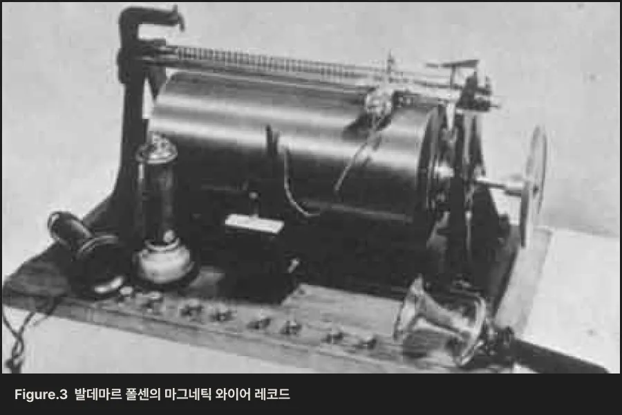 폴센의 장치는 에디슨의 축음기와 매우 유사하지만, 실린더가 강철 와이어로 감싸져 있고, 와이어에 전자석이 접촉해 있다는 점이 달랐죠. 이때 전자석이 축음기의 바늘 역할을 하며, 실린더가 회전하면서 소리가 기록되었죠. 폴센은 이 장치를 텔레그래폰Telegraphone 이라고 불렀습니다.