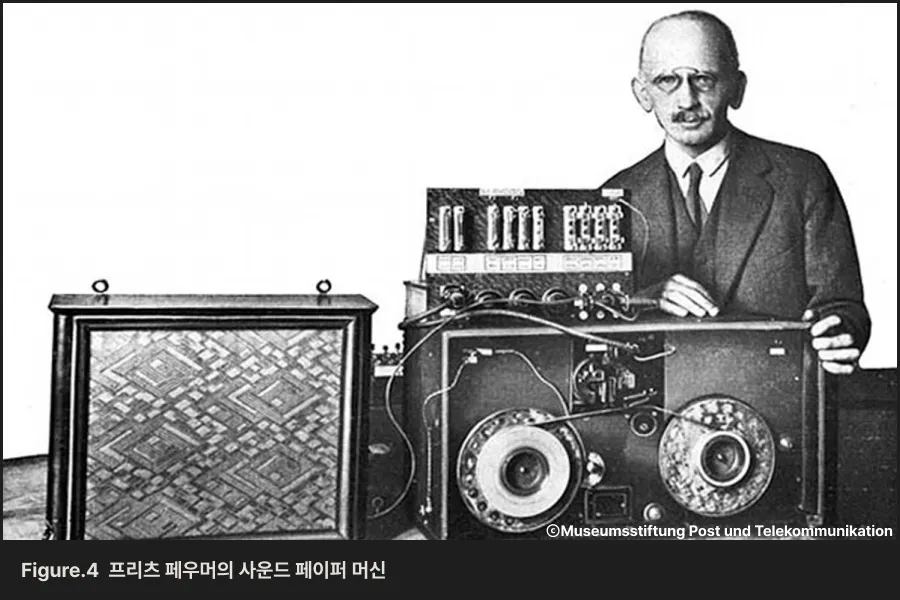 와이어 레코더와 강철 리본 레코더는 풀리면 다시 감기가 매우 어려웠고, 끊어질 경우 다시 용접해야 하는 등 사용성이 안 좋았습니다. 이러한 문제를 해결하기 위해 1928년, 독일 엔지니어 프리츠 페우머Fritz Pfeumer 는 종이 테이프에 산화철을 코팅하여 녹음 테이프를 만들었고, 세계 최초의 테이프 레코더인 사운드 페이퍼 머신Sound Paper Machine 을 만들었습니다. 하지만 이 사운드 페이퍼 머신의 코팅된 자기 테이프는 표면이 고르지 않았고, 코팅이 잘 붙어있지 않아 재생 중에 자성 입자가 헤드와 접촉하면서 떨어졌죠. 이로 인해 이 기계는 "샌드페이퍼 기계"라는 악명이 붙게 되었죠.