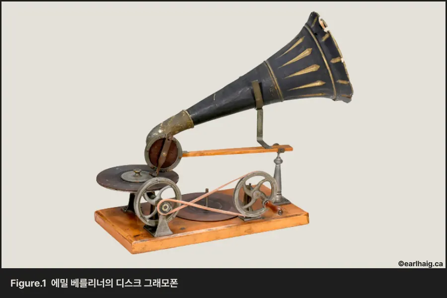 음성을 기록하는 장치는 토머스 에디슨Thomas Edison 이 포노그래프Phonograph 를 발명하고, 에밀 베를리너Emile Berliner 가 축음기를 개선한 디스크 그래모폰을 만들며 시작되었습니다. 그래모폰의 기본 원리는 소리 파형을 매체에 기계적으로 기록하고, 그 파형을 진동으로 재생하는 것이었죠. 이러한 디스크 그래모폰 기술은 LP로 발전하게 됩니다.