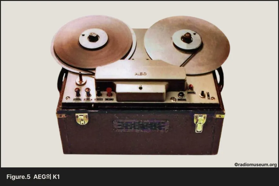 이러한 테이프 레코드의 한계들로 인해 대다수 유럽에서는 디스크 레코더가 주류였습니다. 반면 독일만은 예외였습니다. 프리츠 페우머의 사운드 페이퍼 머신을 시작으로 릴투릴 레코더가 주류였죠. 1930년대 독일의 AEG에서 마그네토폰Magnetophon을 1935년에는 K1을 연이어 발표했고, 1939년 독일 대부분의 방송국에는 마그네토폰이 설치되어 있었습니다. 1942년에는 AC바이어스가 도입되어 마그네토폰의 음질이 크게 개선되며 고품질의 사전 녹음된 방송을 송출할 수 있었죠.