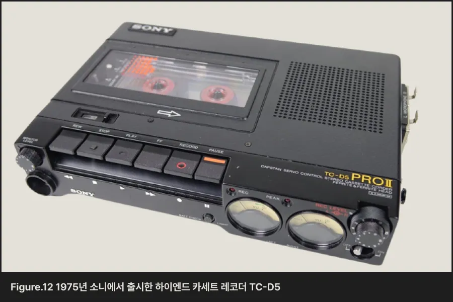 그러나 소형 휴대용 테이프 레코더에는 문제가 있었는데요. 걸으면서 받는 충격 때문에 카세트 테이프의 회전에 간섭이 생겨 재생에 문제가 생길 수 있다는 점이었죠. 소니에서는 1975년 출시한 고성능 휴대용 Hi-Fi 데크 TC-D5에서 이 문제를 해결합니다.