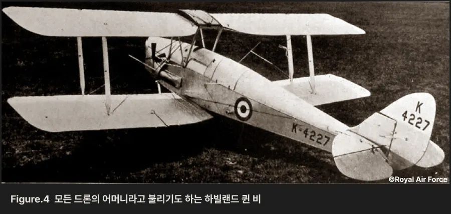 1930년대에 영국은 군함에서 빠르게 회전하는 항공기를 명중시키는데 어려움을 겪고 있었습니다. 이를 훈련하기 위해 드론이 사용되었습니다. 당시 사용된 드론은 드 해빌랜드 퀸 비de Havilland Queen Bee 으로, 기존의 타이거 모스Tiger Moth 의 프레임을 나무 합판으로 만들어 저렴하고 바다에 불시착해도 가라앉지 않도록 했습니다.