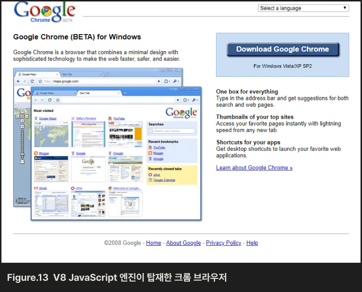 이를 위해 구글은 문서 작성(Google Docs), 이메일(Gmail), 캘린더 같은 웹 기반 소프트웨어를 차례로 개발합니다. 하지만 웹 애플리케이션을 제대로 작동시키기 위해서는 당시 브라우저의 성능으로는 한계가 있었습니다. 이에 구글은 스스로 브라우저를 만들기로 결정하고, 브라우저의 핵심 구성 요소인 자바스크립트 엔진도 직접 새로 개발하기로 합니다.