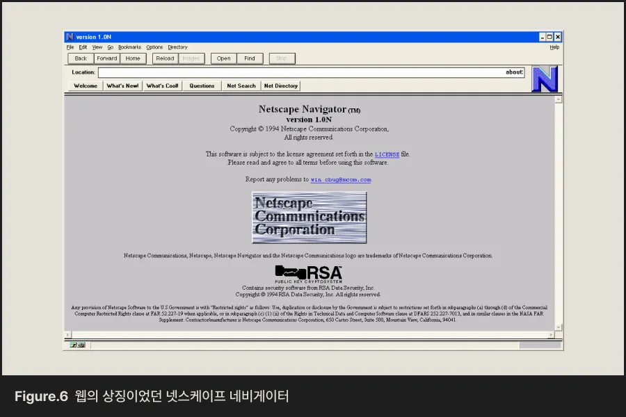 모자이크의 성공에도 불구하고 모자이크 개발을 주도했던 아르바이트생 앤드리센은 정식 개발팀에 포함되지 못했고, 앤드리센은 NCSA를 떠나 넷스케이프Netscape 를 창업합니다. 그리고 1994년 10월, ‘넷스케이프 네비게이터Netscape Navigator’라는 웹 브라우저를 출시합니다. ‘넷스케이프 네비게이터’는 상업적인 용도가 아니라면 누구나 무료로 사용할 수 있었습니다. 덕분에 출시한 지 3개월도 채 되지 않아 200만 건이 넘는 다운로드를 기록하며 폭발적인 반응을 일으켰고, 넷스케이프 네비게이터는 웹의 상징이 되었죠.