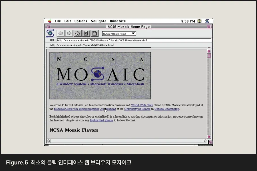 1993년, 시카고의 NCSA(국립 슈퍼컴퓨터 응용센터)에서 아르바이트를 하던 마크 앤드리센Marc Andreessen은 NCSA 소속 프로그래머인 에릭 비나Eric Bina 와 함께 유닉스를 지원하는 웹 브라우저 ‘모자이크Mosaic’를 개발합니다. 모자이크는 마우스를 이용해 인터넷을 탐색할 수 있는 클릭 인터페이스를 제공한 최초 브라우저로, 일반 사용자들도 손쉽게 웹을 사용할 수 있도록 만든 획기적인 프로그램이었습니다. 모자이크의 가능성을 확인한 NCSA는 인력을 보강해 같은 해 윈도우와 매킨토시 버전도 출시했습니다. 그 결과 단 두 달 만에 100만 건이 넘는 다운로드를 기록하며 큰 성공을 거두었습니다. 이로써 웹은 고퍼를 제치고 대중화의 길에 들어서게 됩니다.