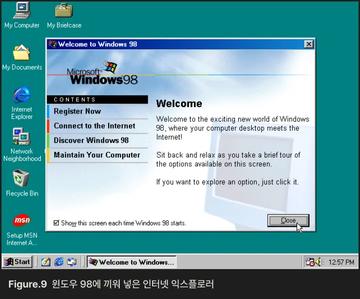 이 상황을 지켜보고 있던 마이크로소프트는 모자이크 브라우저에 라이선스 비용을 지불하고 ‘인터넷 익스플로러Internet Explorer ’를 개발하여 1995년 브라우저 경쟁에 뛰어들죠. 인터넷 익스플로러 2.0부터는 브라우저를 무료 제공을 하며 공격적으로 마케팅합니다.