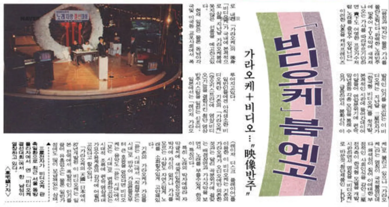 1980년대 일본에서는 영상이 나오는 가라오케가 등장합니다. 화면에는 가사가 나오고, 박자에 맞게 글씨가 변하는 기계였죠. 국내에서는 1990년대 초반 삼성전자가 ‘비디오케’를 선보였습니다. 당시 비디오케의 가격은 업소용 148만 원, 가정용 64만 8천 원으로 고가의 제품이었음에도 불구하고 1992년 한 해 동안 국내 12만 대, 국외 7만 대가 팔리며 ‘올해 삼성전자의 최대 히트 상품’으로 선정됩니다. 당시 삼성전자는 판촉 활동으로 노래 자랑 결선 대회를 열기도 했어요.