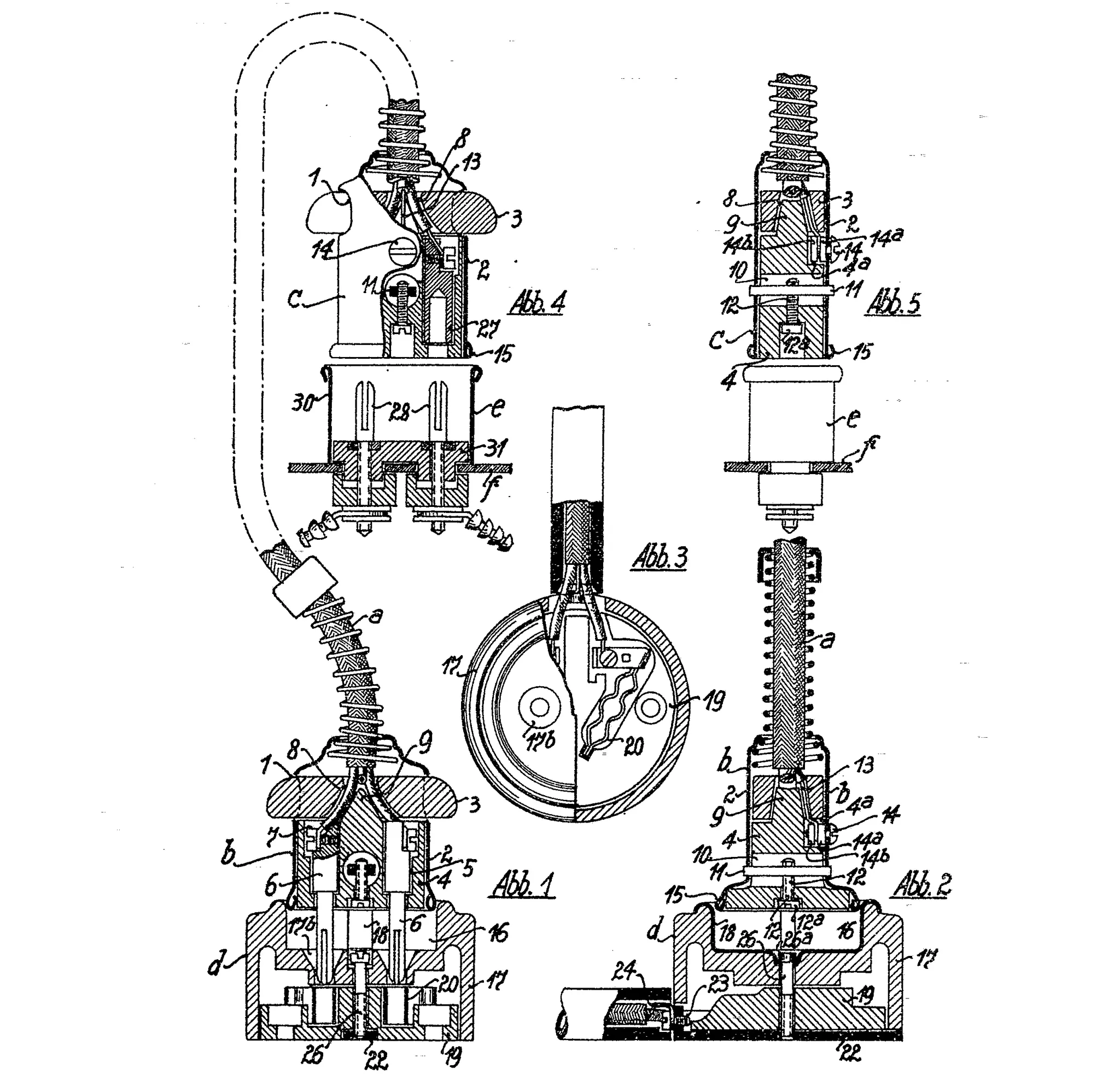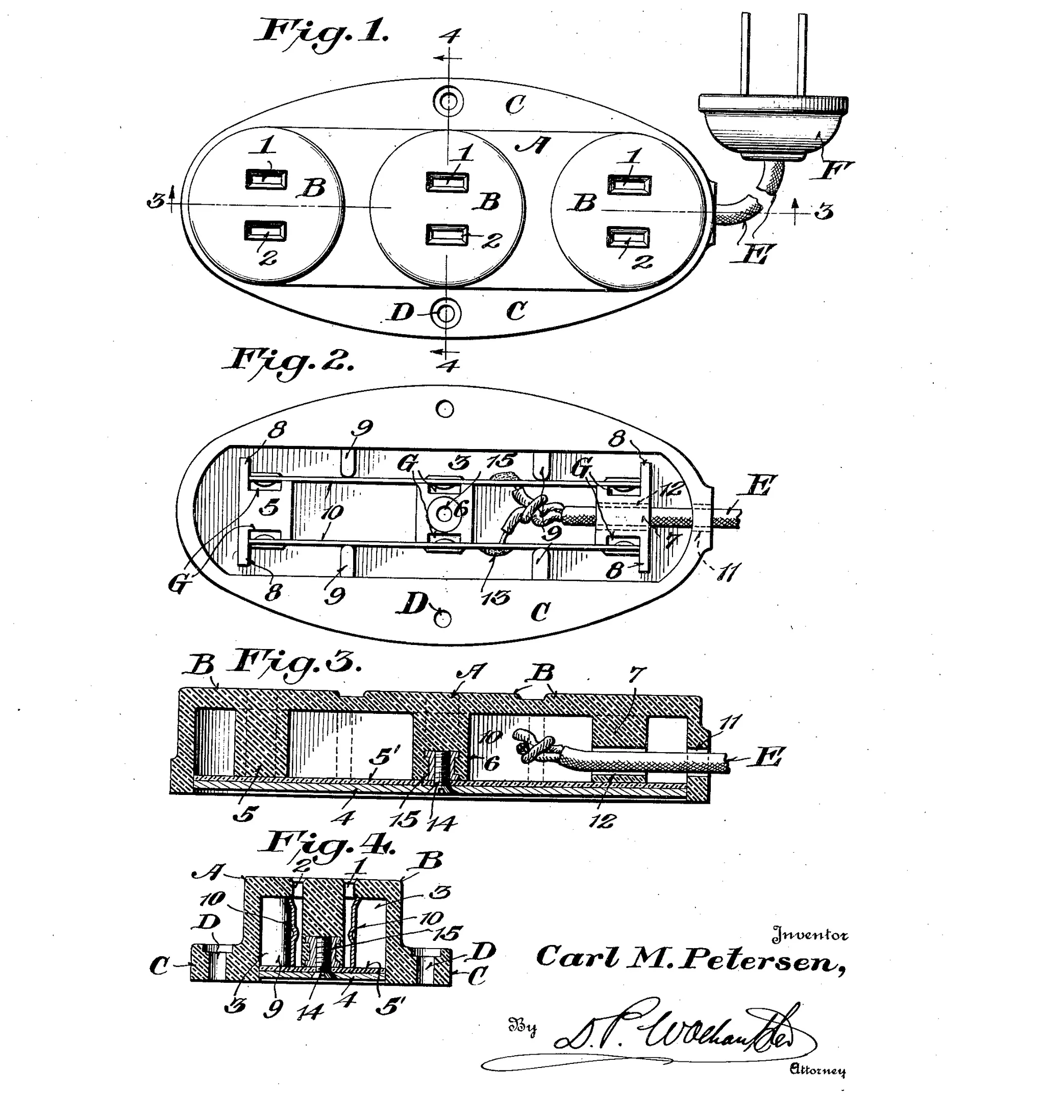꽂는 형태의 플러그는 유럽에서 먼저 등장합니다. 1882년 영국의 토머스 테일러 스미스Thomas Taylor Smith 가 ‘전기 회로 연결’에 대한 특허를 낸 것이 최초이죠. 1889년 제너럴 일렉트릭 컴퍼니 카탈로그에도 꽂는 플러그가 등장한 것을 보면 상용화도 빠르게 이루어진 것을 알 수 있습니다.