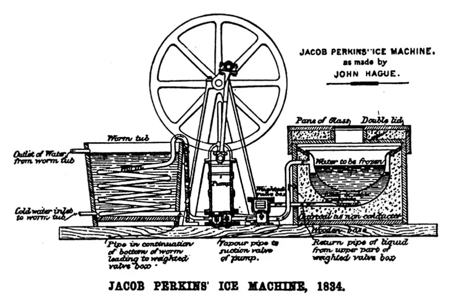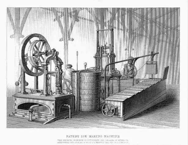 실제로 만들어낸 것은 에번스와 함께 증기 기관에 대한 일을 했던 영국의 발명가 제이컵 퍼킨슨Jacob Perkins 입니다. 하지만 퍼킨슨의 제빙기는 효율이 너무 나빠서 잘 사용되지 않았다고 합니다. 이후로도 예일대학교의 교수 알렉산더 트와이닝Alexander Twining, 플로리다의 의사 존 고리 John Gorrie 등이 제빙기 사업에 뛰어들었지만, 천연얼음에 비해 너무 비싸 모두 망했죠.