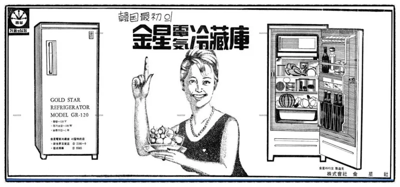 국내에 처음 등장한 냉장고는 금성사의 GR-120 눈표 냉장고입니다. 그전까지는 수요도 거의 없었거니와 해외의 냉장고를 들여와서 사용했죠. 눈표 냉장고는 1965년 일본 히타치사와 기술 제휴하여 개발한 것이었는데요. 냉장과 냉동 칸의 문이 따로 있지 않고 하나의 문만 있는 형태였죠. 그리고 당시 냉장고 가격은 8만 원 정도였는데요. 당시 대졸 초임 월급이 만 천 원쯤 하던 때라 상당히 고가의 제품이었죠.