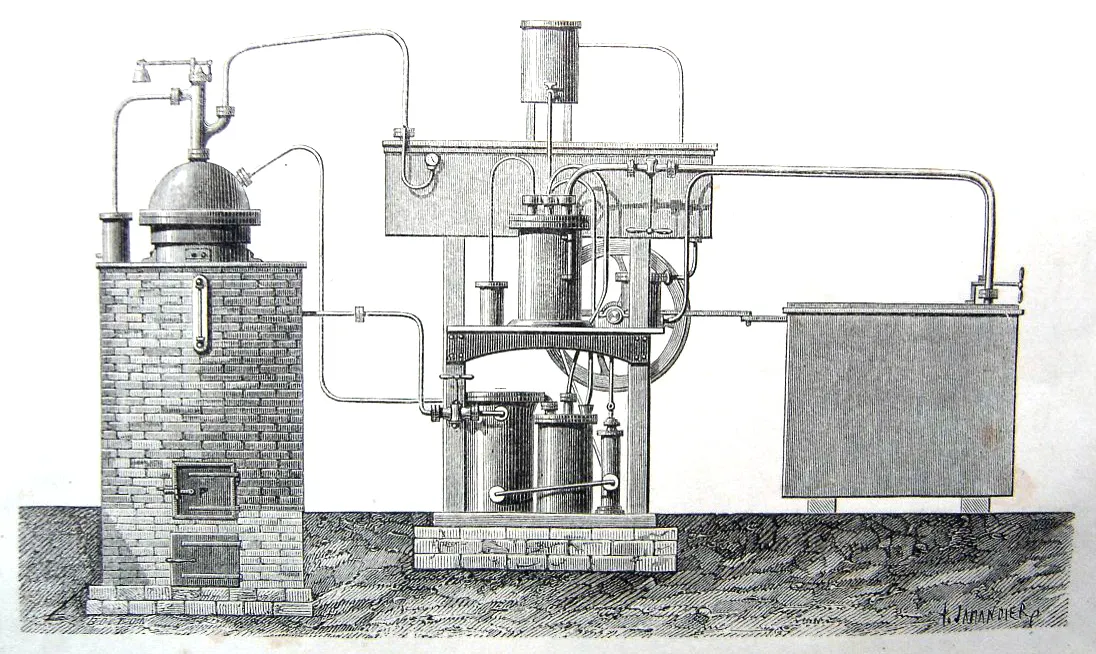 하지만 해리슨이 만든 기계도 너무 거대하다는 문제점이 있었는데요. 이는 냉매로 사용하는 에테르 때문이었죠. 그리하여 1859년 프랑스의 페르디낭 카레Ferdinand Carré 가 에테르가 아닌 암모니아를 냉매로 하는 냉장고를 만들어내 냉장고의 크기를 줄이는 데 성공합니다. 게다가 1880년대에 값싼 암모니아 냉매가 공급되면서 인공 얼음 공장들도 많이 생기기 시작하죠.