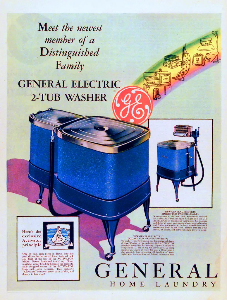 1931년 출시된 GE의 2-Tub Washer는 탈수기가 위에 붙어 있다는 점을 혁신이라며 대대적으로 홍보합니다. 물론 아래서 헹군 빨래를 직접 빼내서 탈수기에 옮겨 물기를 짜내야만 했죠.