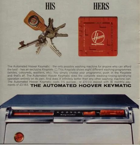 1961년에는 빨래 옵션을 선택할 수 있는 세탁기가 등장합니다. 후버의 키매틱Keymatic 으로 게임기에 게임팩을 꽂듯이 세탁기에 키카드를 넣으면 프로그래밍된 빨래 옵션이 실행되는 세탁기였어요.
