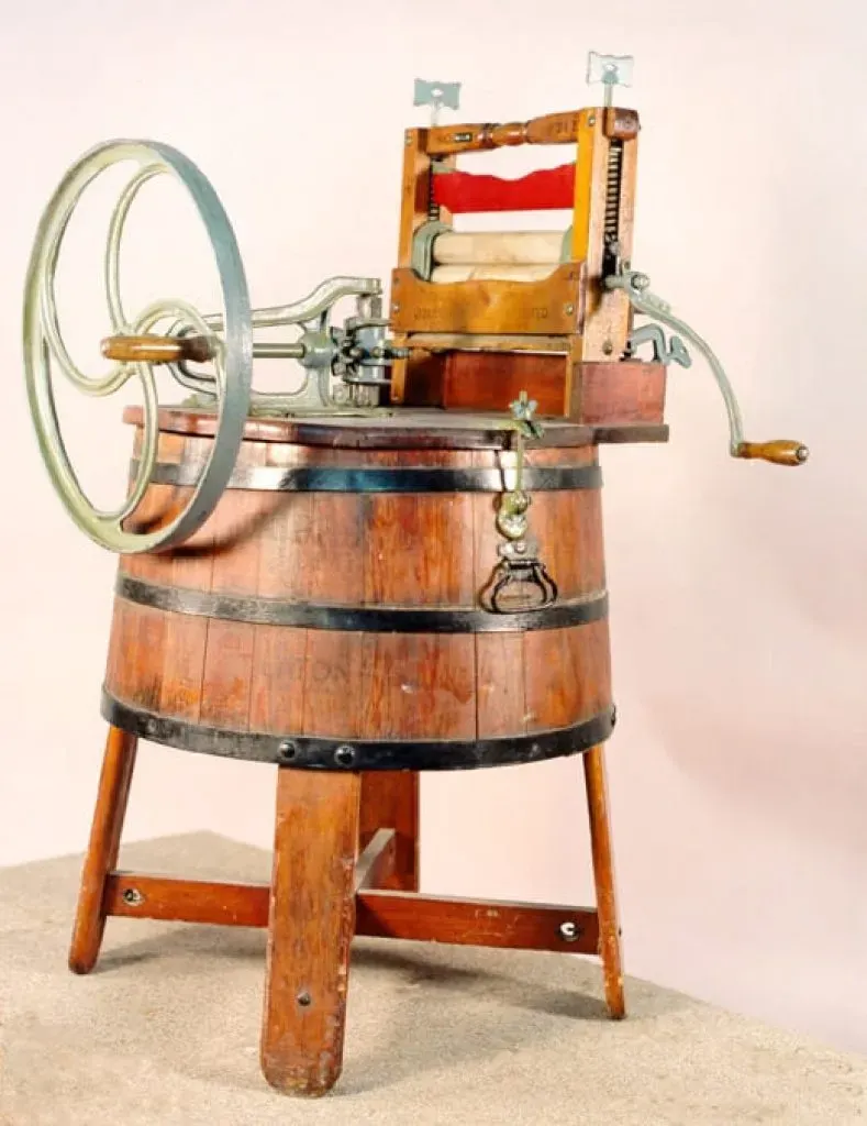 최초의 세탁기는 1767년 야코프 크리스티안 셰퍼Jacob Christian Schaffer 에 의해 탄생합니다. 손으로 축을 돌리면 통 안에 있는 솔이 돌아가는 형태였어요. 돌리는 행위를 좀 더 쉽게 만든 형태가 등장합니다. 이후로도 수많은 세탁기가 발명되고 누가 최초인지에 대한 말이 많은데요. 19세기까지 대부분 원형 통에 크랭크축으로 돌리는 형태로 큰 차이는 없어 보입니다. 물론 이런 저세상 세탁기도 있습니다.