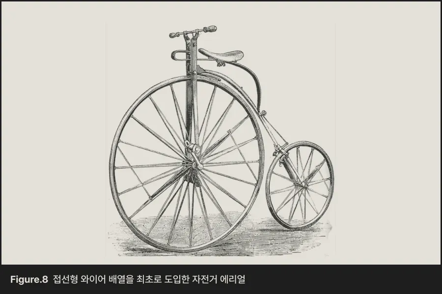 바퀴살은 나무에서 와이어로 진화합니다. 와이어 휠의 개념은 1808년 조지 케일리George Cayley 에 의해 처음 등장했지만, 그는 특허를 신청하지 않았습니다. 결국 와이어 휠에 대한 최초의 특허는 1826년 영국의 시어도어 존스Theodore Jones 가 획득했으며, 자전거 와이어 휠에 대한 최초의 특허는 1869년 프랑스의 외젠 메이어Eugène Meyer에게 돌아갔죠.